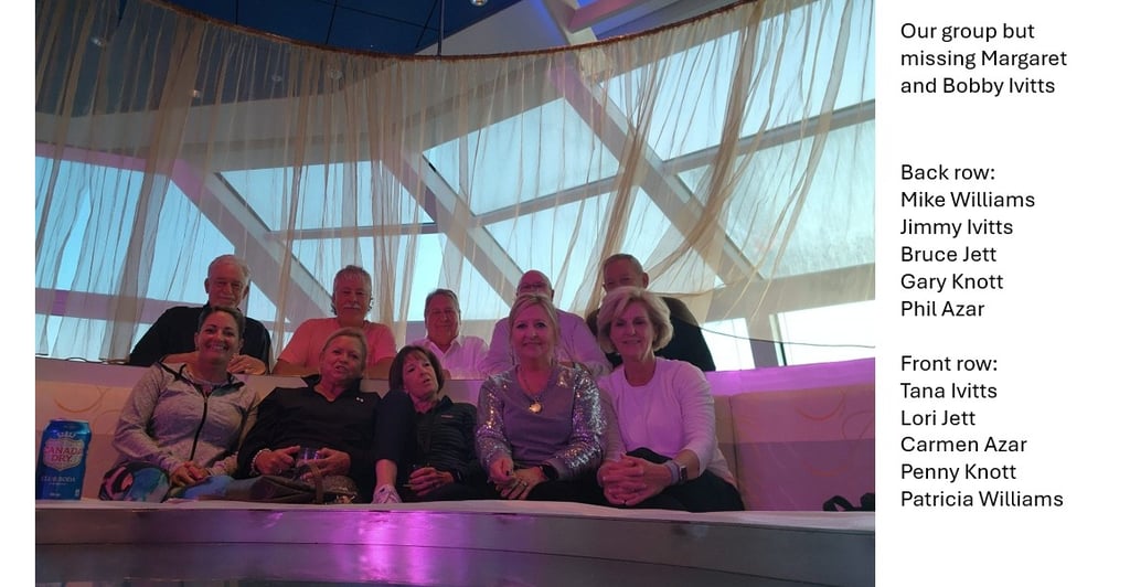 In June 2024, 6 couples went on an Alaskan cruise adventure aboard Celebrity Solstice! Margaret and Bobby Ivitts, Jimmy and Tana Ivitts, Mike and Patricia Williams, Carmen and Phil Azar, Bruce and Lori Jett and Gary and Penny Knott.